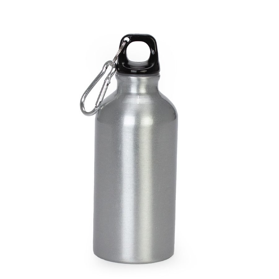 Botella deportiva de aluminio. Para líquidos fríos (no térmico). Capacidad 420ml. Con tapa rosca negra y argolla para colgar. Producto BPA FREE, para el contacto con líquidos y alimentos. Presentación en caja de regalo de cartón laminado color plata.