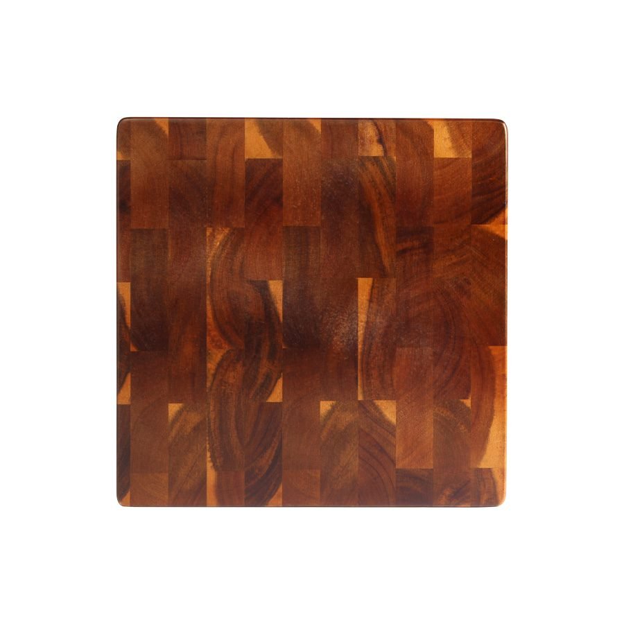 Fina tabla cuadrada de madera sólida de ACACIA con piezas integradas, diseño único para sorprender! Ideal para cortar y/o servir verduras, quesos, frutos secos o picoteo. Madera trabajada y acabada en máquina, de forma 100% regular, con superficies, laterales y cantos suaves y redondeados, para una mayor higiene y comodidad al momento de cortar y servir alimentos.  – Densidad aprox. 770kg/m3. – Dureza 9.5 (test de Monnin)