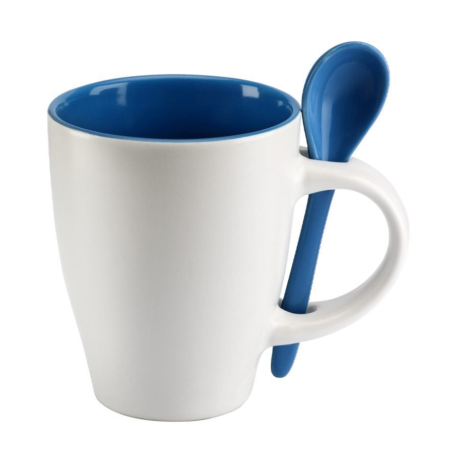 Tazón Cerámico Blanco opaco con interior y cuchara de color. Presentación en caja de cartón blanco.