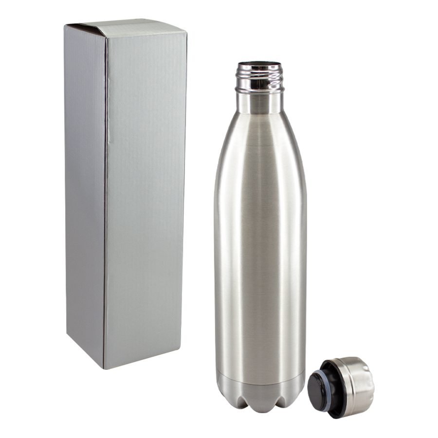 Termo modelo «Botella» de 750cc, en Acero inoxidable, tapa rosca. Presentación en estuche de cartón laminado plateado.