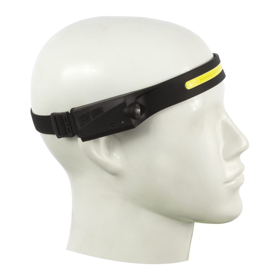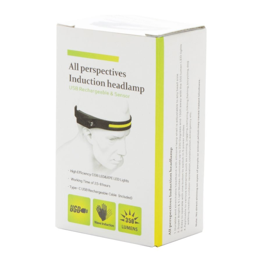 La mejor linterna LED para cabeza del mercado. Contenida en banda elástica de silicona negra con strap tamaño ajustable. Recargable con terminal USB, no usa pilas convencionales. Contiene 2 linternas LED: una banda frontal COB LED enfoque abierto + 1 luz XPE LED lateral enfoque concentrado. Ambas luces LED de alta intensidad (350 LUMENS), Cada luz LED con 2 funciones de intensidad + una quinta función estroboscópica (titila). Tiempo de Carga: 2 horas, tiempo de uso: hasta 8 horas. Contiene cable cargador USB / TYPE-C. Contiene sensor de encendido/apagado y displasy de poder. Contiene batería interna (built-in) de 1200mAh. Genial para uso en labores hand-free (manos libres): ej. bodegas, labores de construcción, manualidades y para hacer deportes nocturnos al aire libre (running, bicileta, etc)