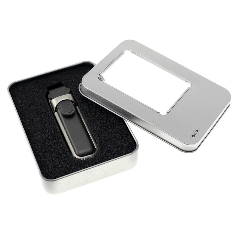 USB Pendrive 2.0 memoria de 64GB, de cuero. Presentación en elegante estuche de aluminio con ventana, dentro de cuna de esponja EVA negra.